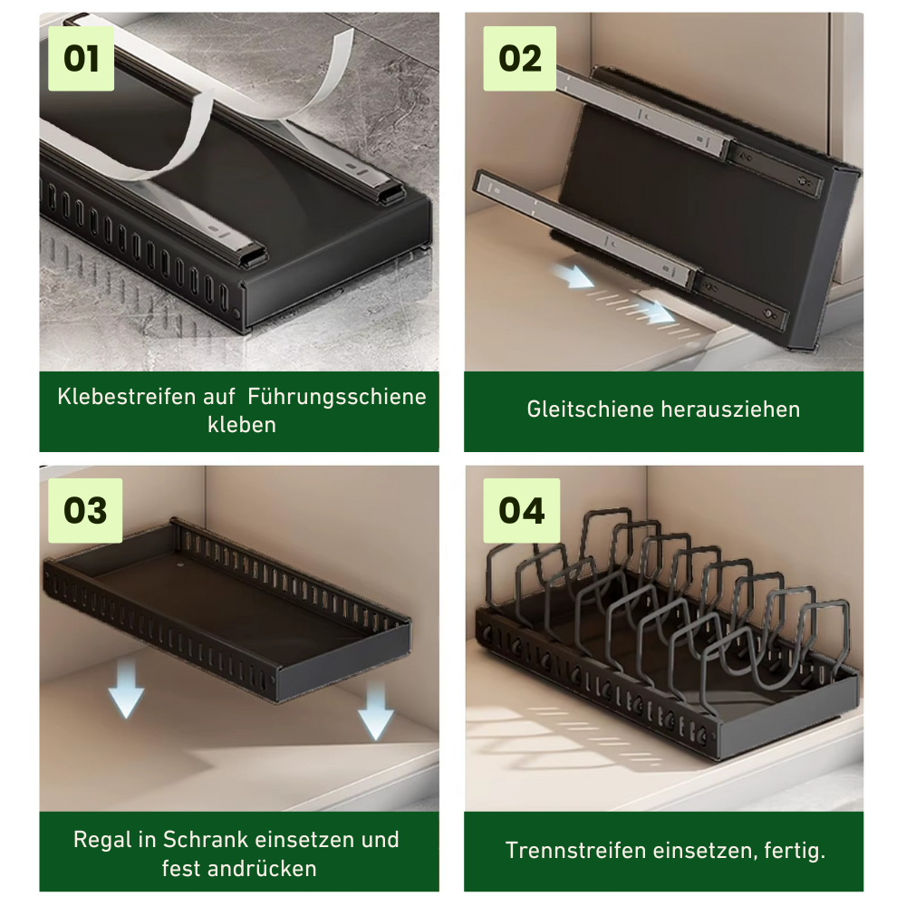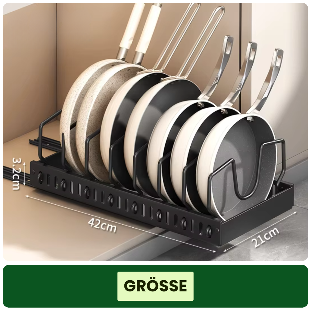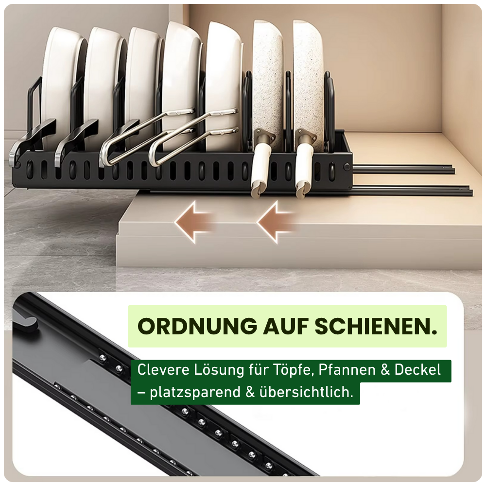 Die cleveren Schienen laufen leichtgängig auf robusten Rollen, sodass du deine Pfannen und Deckel mühelos rausziehst. Kein Herumwühlen mehr, kein nerviges Klappern beim Herausnehmen.