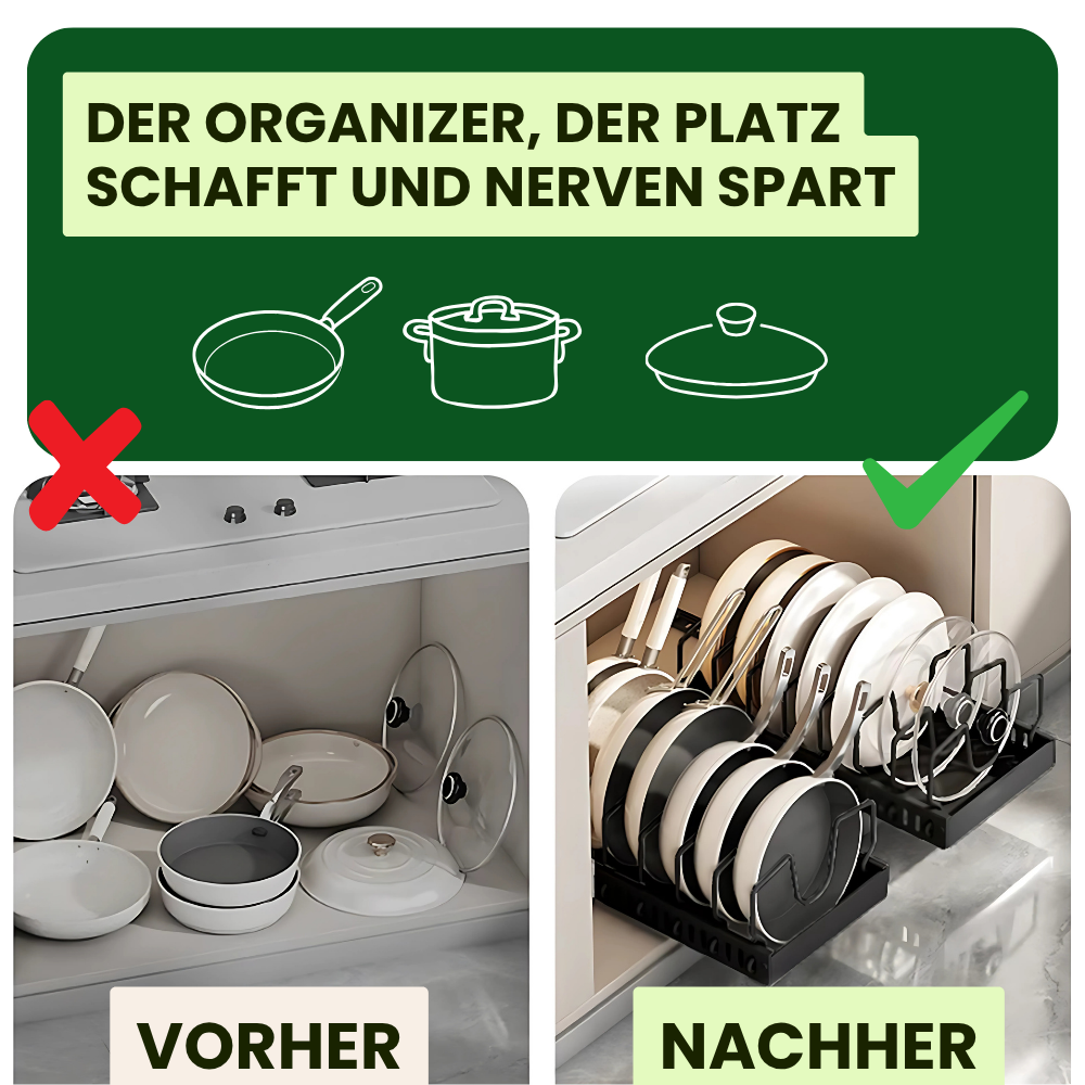 Schluss mit gestapelten Pfannen, verkanteten Deckeln und endlosem Suchen. Mit dem ausziehbaren Organizer holst du dir endlich Übersicht in deinen Küchenschrank. Einfach herausziehen, alles griffbereit – sauber sortiert und perfekt aufgeräumt.