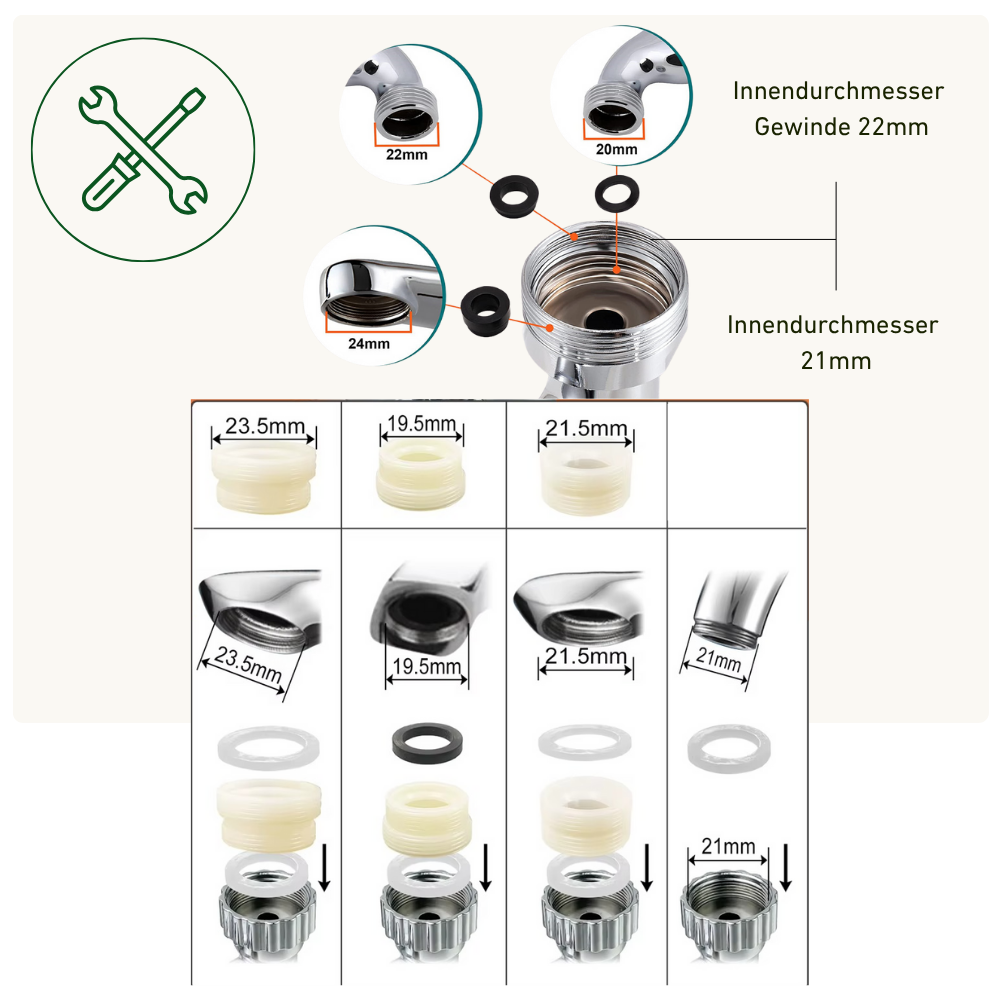 Farbe: silberfarben Material: Messing Gewicht: 175g Größe: Innendurchmesser: 21mm, Innengewinde-Durchmesser 22mm passend für: fast alle runden Hähne in Bad & Küche Sonstiges: mit 1080° Gesamt-Rotation, mit Filterelement, 1 oder 2 Wassermodi (je nach gewähltem Modell)